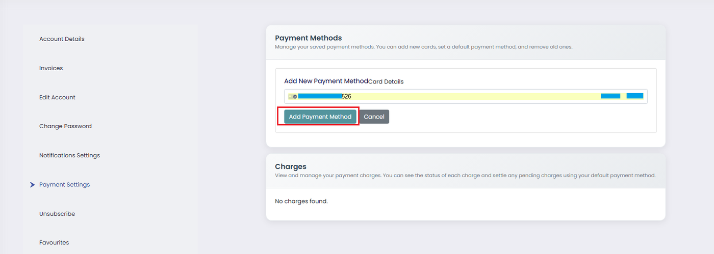 To add a new payment method, click '+Add Payment Method'. Enter your card details (card number, expiration date, security code, and billing address).