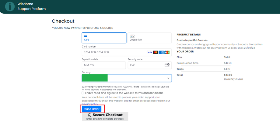 After entering your payment information, click 'Place Order' to complete the purchase.
