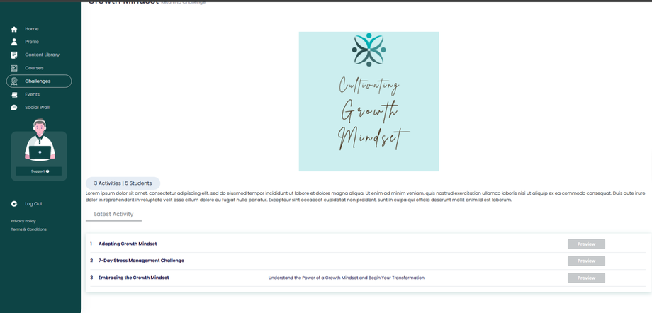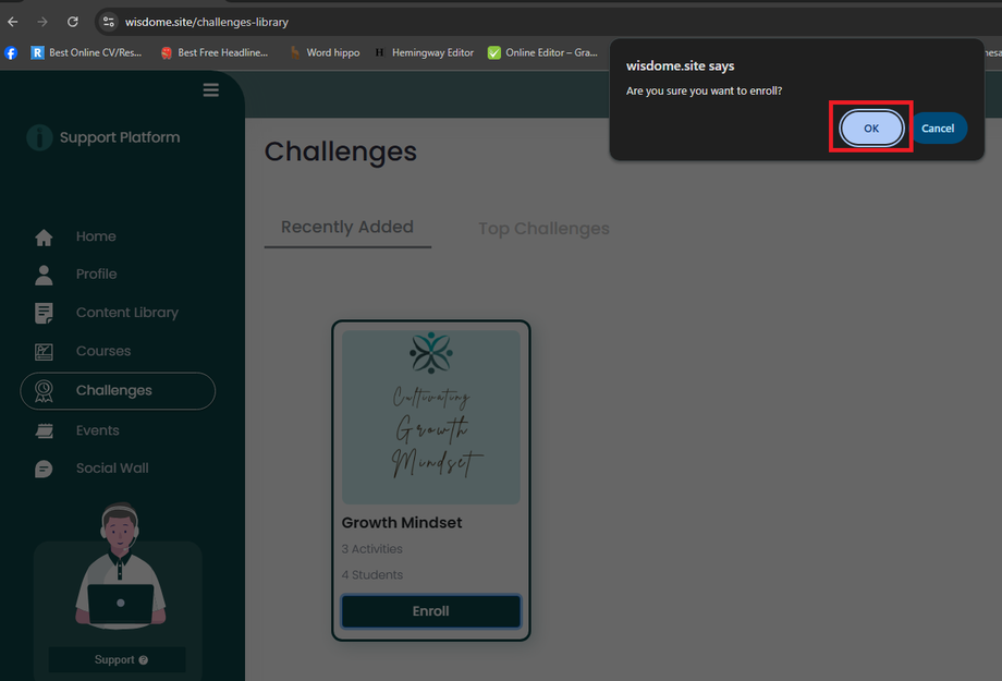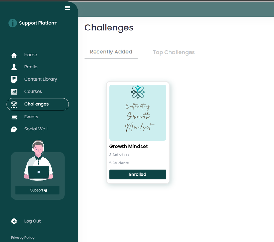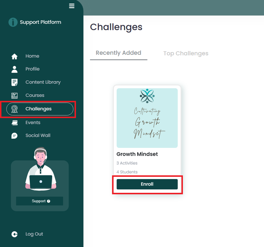 2. Select 'Challenges' from your dashboard's side menu and click 'Enroll.'