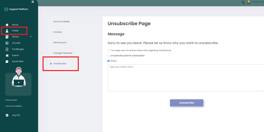 1. Navigate to the "Profile" section on the home page and select the "Unsubscribe" option.